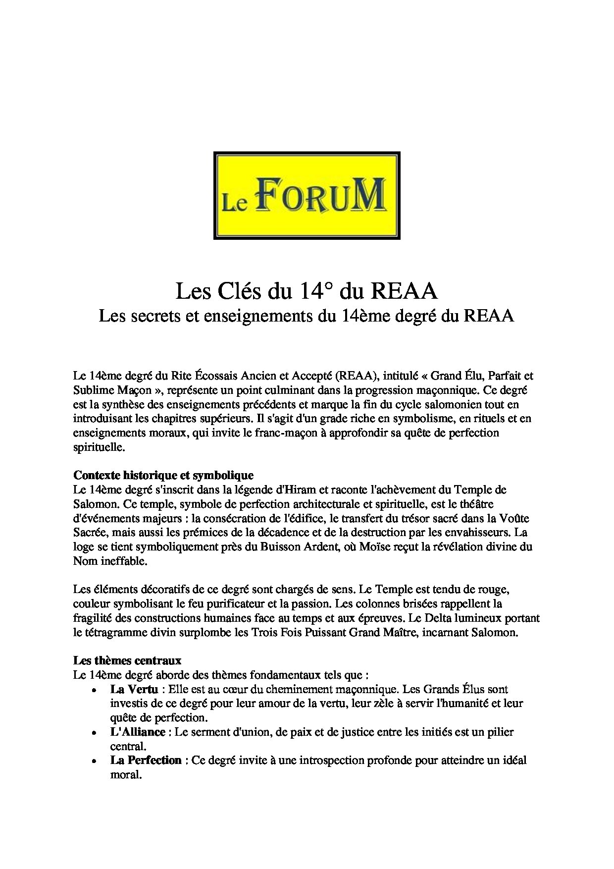 Ce Travail sur – Les Clés du 14° du REAA : Les secrets et enseignements du 14ème degré du REAA – Comporte 568 mots et s’expose en 4 minutes avec une lecture Réaliste.
