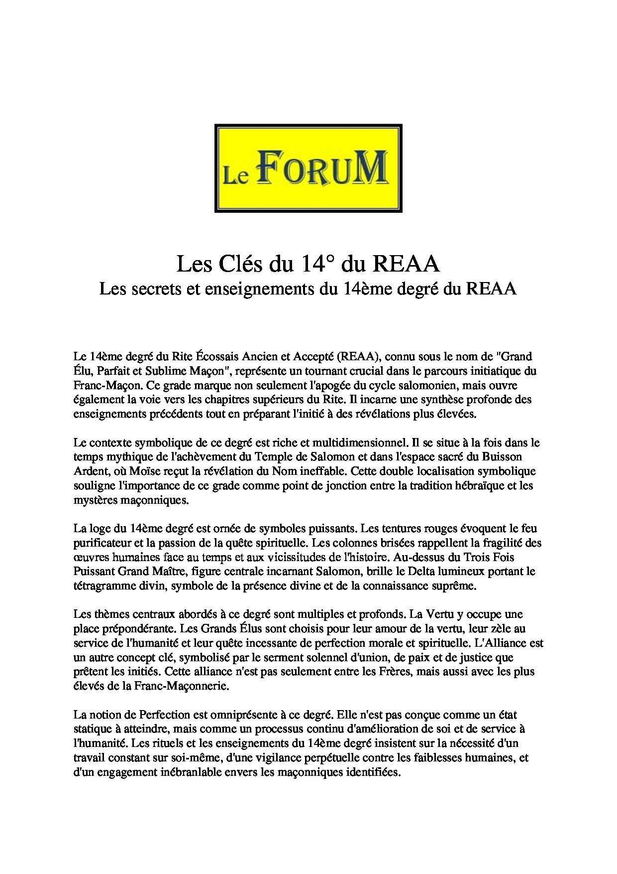 Ce Travail sur – Les Clés du 14° du REAA : Les secrets et enseignements du 14ème degré du REAA – Comporte 1091 mots et s’expose en 8 minutes avec une lecture Réaliste.