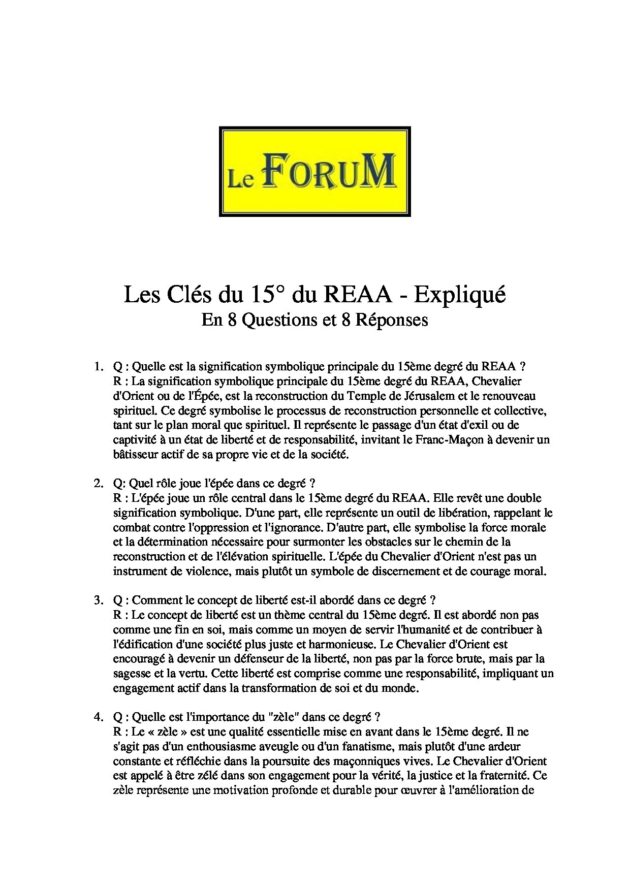 Ce Travail sur – Les Clés du 15° du REAA – Expliqué : En 8 Questions et 8 Réponses – Comporte 769 mots et s’expose en 6 minutes avec une lecture Réaliste.