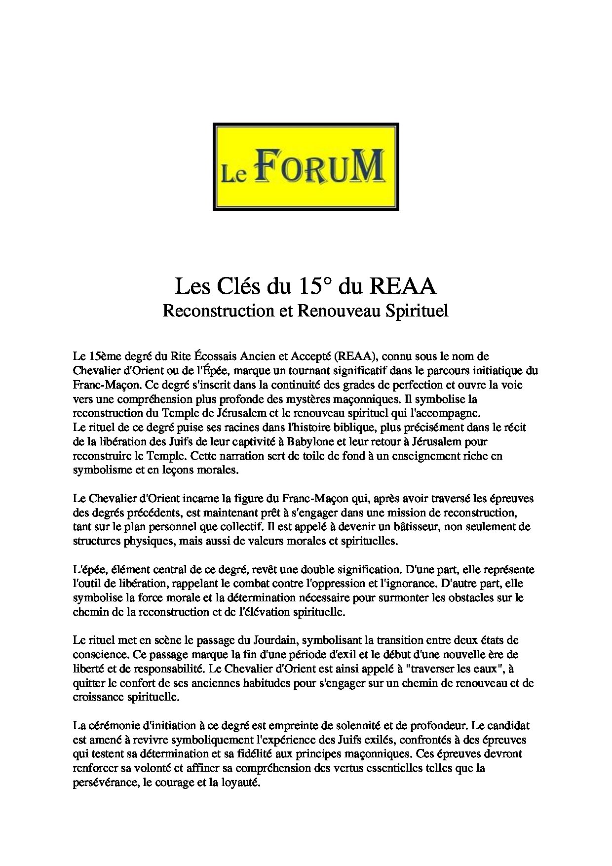 Ce Travail sur – Les Clés du 15° du REAA : Reconstruction et Renouveau Spirituel – Comporte 1138 mots et s’expose en 8 minutes avec une lecture Réaliste.
