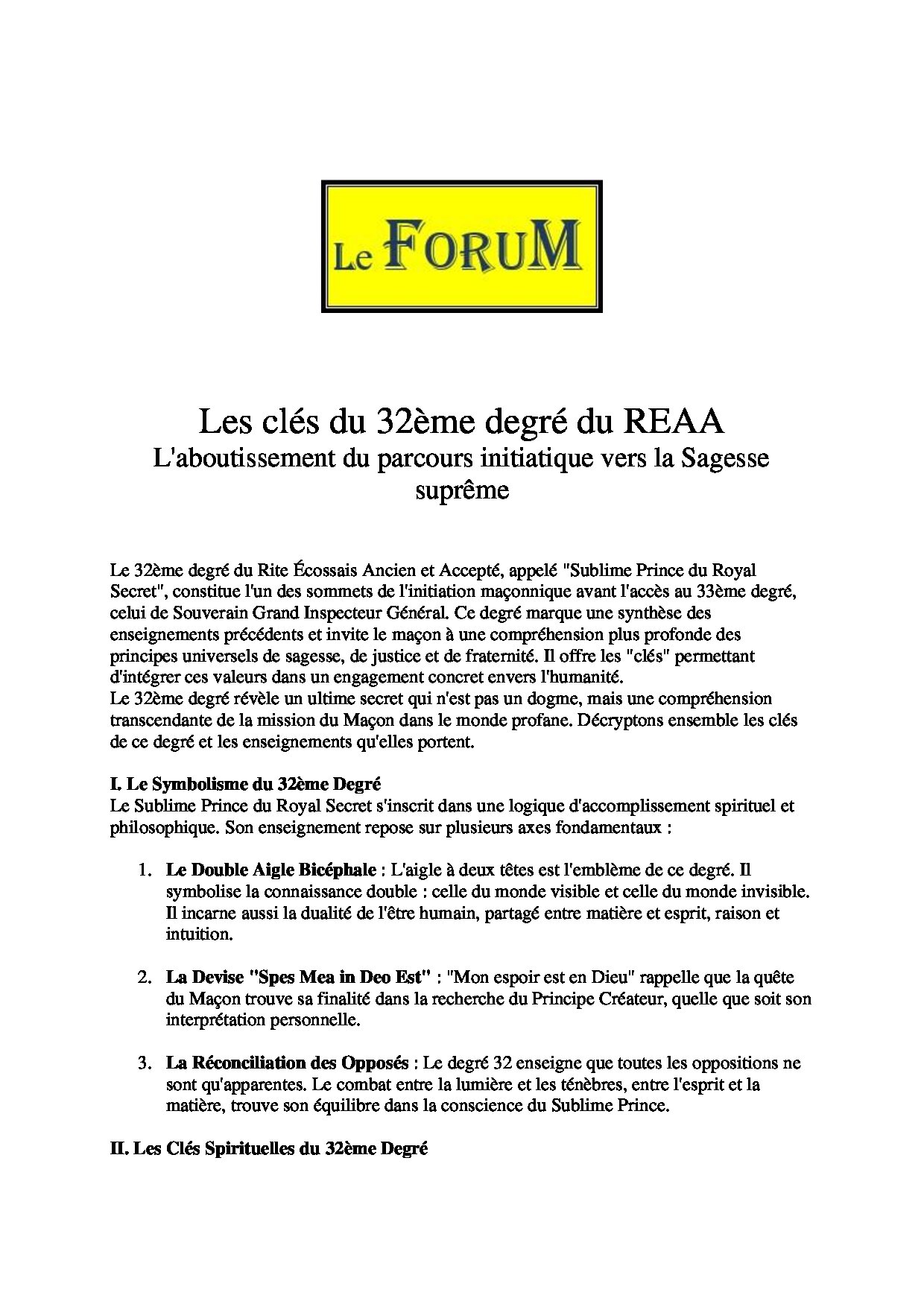 Ce Travail sur – Les clés du 32ème degré du REAA : L’aboutissement du parcours initiatique vers la Sagesse suprême – Comporte 824 mots et s’expose en 6 minutes avec une lecture Réaliste.