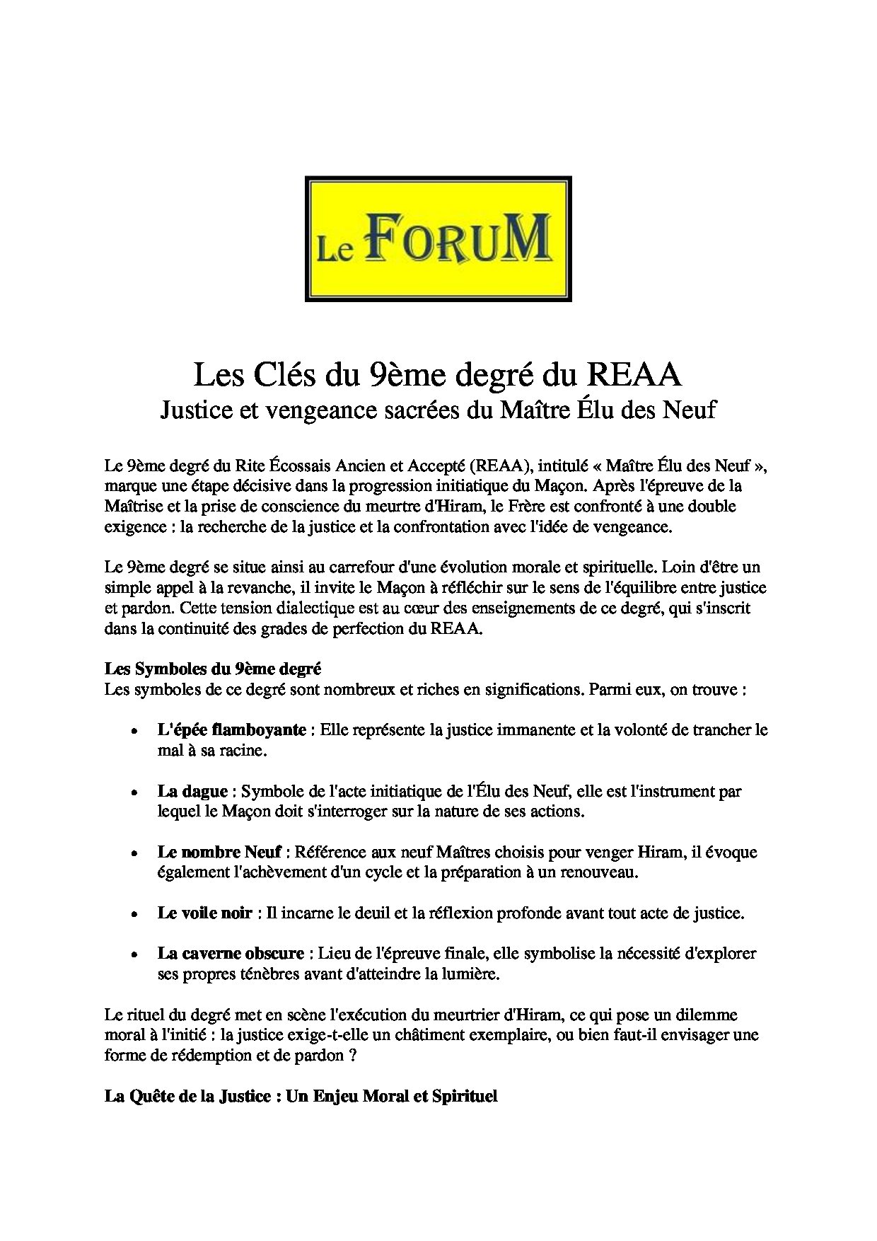 Ce Travail sur – Les Clés du 9ème degré du REAA : Justice et vengeance sacrées du Maître Élu des Neuf – Comporte 915 mots et s’expose en 7 minutes avec une lecture Réaliste.